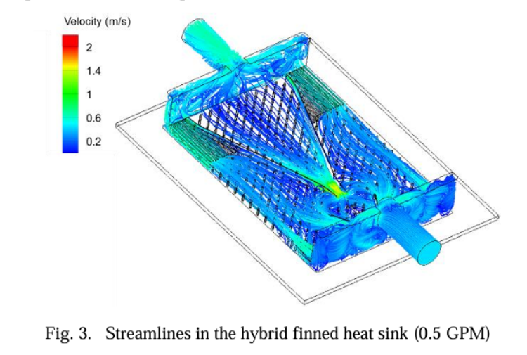 香港中文大学团队设计了一款混合翅片冷板,包含导流墙、矩形翅片和针翅片,通过导流墙引导冷却液至角落热点区域,矩形翅片增强局部换热,降低并旋转的针翅片减少质量。在入口温度 20℃、流速 0.5 GPM、热负载350W 下,实现热点温度 314.5 K、压降 2.12 kPa、FOM 0.712,较参考直通道设计通过减质和降压提升了 FOM。