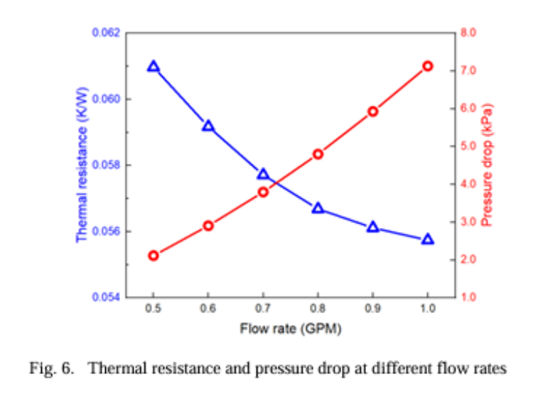 A:在 2 L/min 流速下,基板平均温度为301 K(28℃),热阻0.02743 K/W,压降720 Pa,品质因数(FOM)达0.8302,优于普渡大学等基准设计,体现了低能耗与高效散热的平衡。