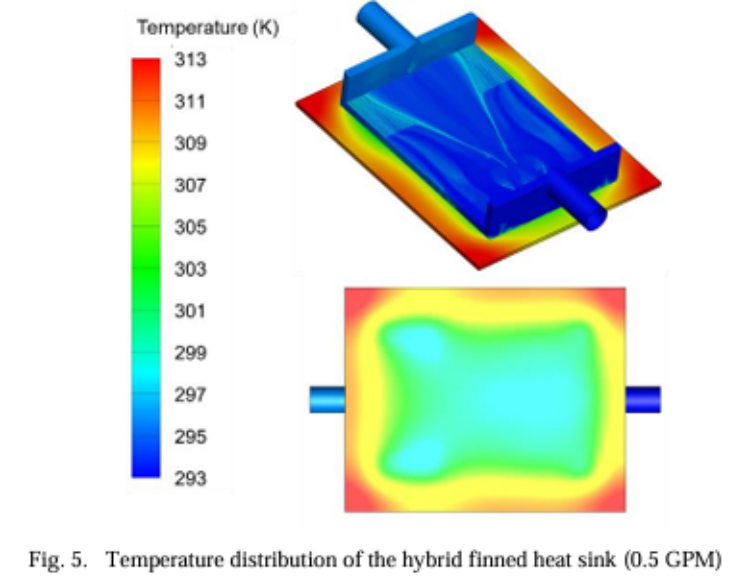香港中文大学团队设计了一款混合翅片冷板,包含导流墙、矩形翅片和针翅片,通过导流墙引导冷却液至角落热点区域,矩形翅片增强局部换热,降低并旋转的针翅片减少质量。在入口温度 20℃、流速 0.5 GPM、热负载350W 下,实现热点温度 314.5 K、压降 2.12 kPa、FOM 0.712,较参考直通道设计通过减质和降压提升了 FOM。
