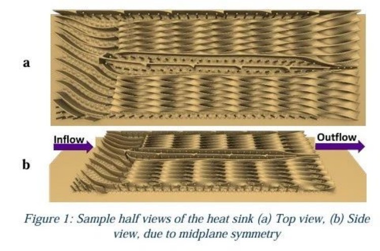 加拿大阿尔伯塔大学与滑铁卢大学团队设计了一款结合热流体拓扑优化(TF-TopOpt)和共形晶格结构的轻量化散热器,利用电化学增材制造(ECAM)实现复杂几何。通过 TF-TopOpt确定主流动路径,结合菱形TPMS晶格增强换热表面积,在0.8 gpm流速下,热阻0.0556 K/W,压降3601.8Pa,质量26.05g,FOM 达 0.670,较传统微通道散热器提升 16.2%,且满足 ECAM 的 0.1 mm 特征尺寸和 20° 悬垂角要求。
