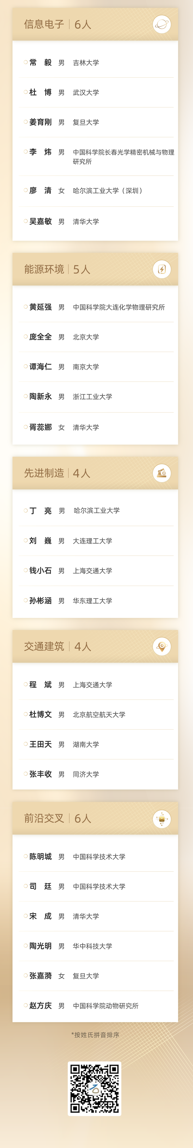 本次获奖青年科学家中,有9位来自中国科学院、5位来自中国科学技术大学。北京大学和上海交通大学均有4位青年科学家入选,南京大学、清华大学、复旦大学(含医院)则均有3位青年科学家入选。西湖大学、哈尔滨工业大学、浙江大学(含医院)分别有2位青年科学家入选。